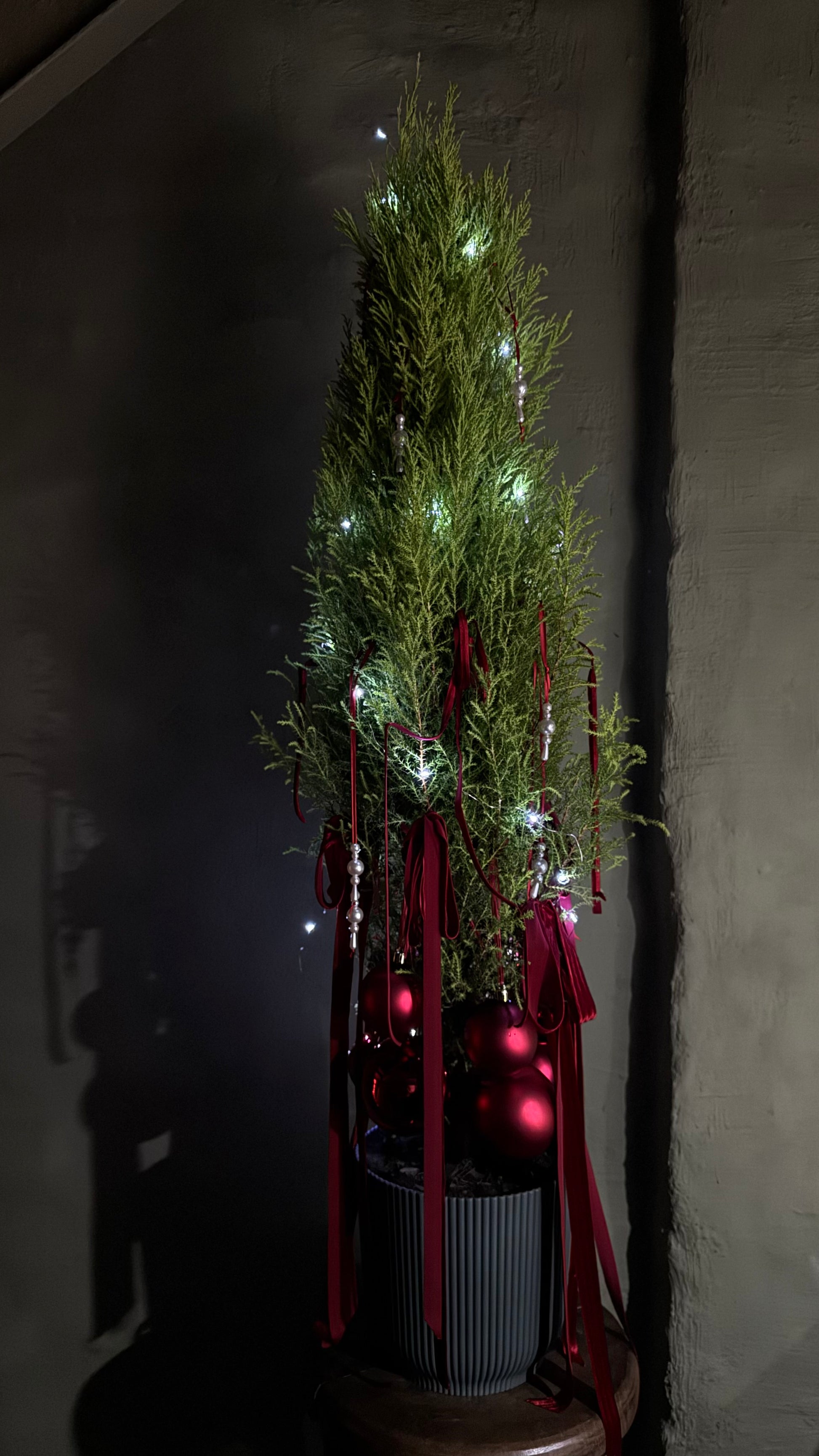 Details: With white lights & red balls & red velvet ribbons in a grey cachepot.